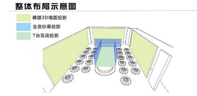 在宴會廳的實際應用中,又分為720度和360度投影。多以宴會廳墻體作為投影載體,結合4D動畫使宴會廳空間呈現(xiàn)動態(tài)的3D立體效果。立體成像在全息宴會廳中具有可變化性,可以根據(jù)不同的需求來變化不同的場景。